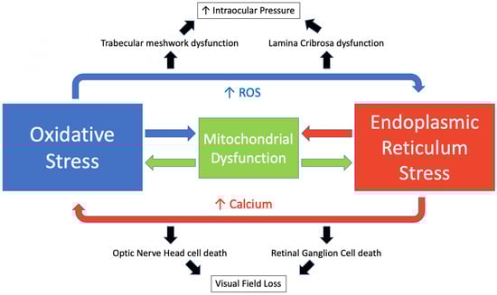 Oxidative and endoplasmic reticulum stress are key drivers of glaucoma, and their mechanisms act in an interconnected manner with calcium (Ca2+) acting as a key intermediary. Ca2+ and ROS act in a reciprocal manner. Increased calcium levels activate the ROS-generating enzymes and formation of free radicals [229]. Meanwhile, increased ROS stimulates an increase in intracellular calcium concentration [230]. The endoplasmic reticulum is the main intracellular calcium store with approximately 2 mM total Ca2+ [230]. During states of ER stress, calcium is released via inositol 1,4,5-trisphosphate (IP3) receptors and ryanodine receptors and accumulates in the mitochondrial matrix [231]. This promotes mitochondrial permeability transition pore opening, ROS accumulation and ATP depletion [232]. ROS may then disrupt the protein folding mechanism, which is dependent on redox homeostasis [21]. This perpetuates a cycle resulting in a further increase in oxidative and ER stress, mitochondrial dysfunction and the induction of apoptosis [233]. We have illustrated this cycle in Figure 5.