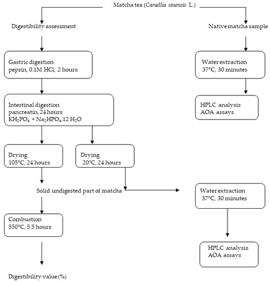 Concerning in vitro digestibility, the dry matter and ash contents of the samples were determined according to the ISO procedures of 1573 and 1575 [,]. The in vitro digestion method was conducted following two consecutive steps: gastric and intestinal as is described above []. The scheme of the in-vitro-simulated digestion procedure is shown in Figure 1. The in vitro digestibility of powdered matcha tea was initially assessed with pepsin and then with pancreatin using a DaisyII incubator (Ankom Technology, Macedon, NY, USA). The matcha tea samples were weighed (0.25 g) into F57 type filter bags, washed with acetone, and sealed by the impulse sealer KF-200H (Penta Servis, Holice, Czech Republic). To simulate gastric digestion, an incubator flask was filled with 1.7 L of 0.1 M HCl containing 3 g of pepsin. The sample bags were incubated at 37 °C for 2 h and washed with redistilled water. For the simulation of intestinal digestion, 3.09 g of KH2PO4 and 32.49 g of Na2HPO4.12 H2O were dissolved in 1.7 L of redistilled water and the pH of the phosphate buffer was set to 7.45 with 0.1 M NaOH. During the second step of digestion, the samples were incubated at 37 °C for 24 h in the phosphate buffer containing of 3 g of pancreatin enzyme. After the incubation, the samples were washed with redistilled water and dried on the filter paper at 105 °C for 24 h. Finally, they were burnt in a muffle furnace at 550 °C for 5.5 h, cooled, and weighed. The in vitro digestibility values (%) were calculated according to Equations (1)–(7):