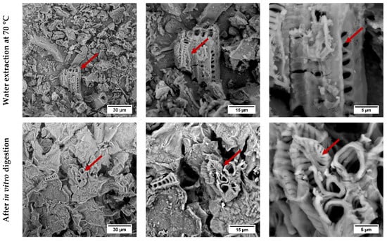 As can be seen, there was no significant degradation observed in the native water extract of matcha tea at 37 °C. The powder matcha sample was subjected to a further analysis at the temperature of 70 °C to observe if any changes occurred in the surface structure. Similar decomposition processes leading to the formation of specific structures indicated by red arrows were monitored for the undigested part of matcha powder and also the powder after the application of 70 °C. The effect of the particle size on the extraction processes and in vitro digestion have been observed. Even though studies examining the effect of matcha tea particle sizes on the digestibility and bioaccessibility of polyphenol compounds is scarce, Shu et al. [] stated that the particle sizes of green tea leaves (D50 values were 564, 75, and 35 µm) significantly influenced the bioaccessibility values of polyphenol compounds (especially catechin flavonoid) after in vitro digestion. The bioaccessibility of polyphenol compounds significantly increased with the reduction of the particle size. Furthermore, cellulose and hemicellulose degradation during grinding may have contributed as well. Hopefully, similar assumptions can be made for matcha tea in future research.
