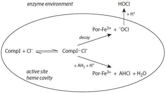 Figure 1. The role of the chloride–Compound I complex (CompI-Cl) in chlorination reactions mediated by MPO according to [44,45]. Explanations are given in the text. CompI denotes Compound I. AH2 represents a substrate that binds near the heme pocket. AHCl is the resulting chlorinated substrate.