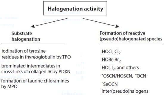 Talking about the products of the halogenating activity of heme peroxidases, a distinction should be made between (i) the halogenation of selected substrates adjacent to heme peroxidases and (ii) the formation of free (pseudo)halogenated species, in particular hypohalous acids and OSCN (Figure 2).