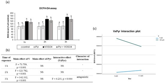 We then examined the intracellular production of ROS in the CHO-K1 cells using DCFH-DA staining after the 1-, 2-, and 3-h exposure to 100 μM VOSO4 in the absence or presence of 4.5 mM sodium pyruvate. As presented in Figure 2a, the ROS level in the CHO-K1 cells after the incubation with 100 μM VOSO4 for 1, 2 and 3 h were significantly increased, compared to the control. The ROS production in the cells treated with 100 μM VOSO4 + 4.5 mM pyruvate was non-significantly reduced (by 16.8%), compared to the VOSO4-exposed cells after a 3-h exposure. As demonstrated by two-way ANOVA, this decrease was caused by the antagonistic interaction between VOSO4 and pyruvate (Figure 2b,c). The cells treated only with pyruvate for 1, 2, and 3 h had a similar intracellular ROS level to that in the control.