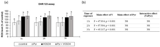 Effects of vanadium and/or pyruvate on ROS accumulation in CHO-K1 cells detected by the DHR123 assay. The DHR123-preloaded cells were incubated in DMEM/F12 medium without (control) or with 100 μM VOSO4 in the presence or absence of sodium pyruvate (Pyr) (4.5 mM) for 1, 2, and 3 h. (a) Intracellular accumulation of ROS on the basis of RH-123 fluorescence emissions expressed in percentage. Data represent the mean ± SD of quadruplicate determinations of 3 distinct experiments. Means at the same time point followed by a common letter are not significantly different. Data were analysed by one-way ANOVA followed by Tukey’s post-hoc test. (b) Results of the two-way ANOVA analysis of RH-123 fluorescence emissions after 1-, 2-, and 3-h exposure to V (as VOSO4) and Pyr (pyruvate); NS: no significant effect.