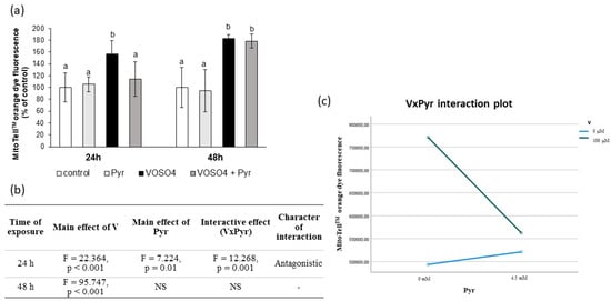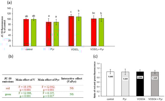 As demonstrated by the two-way ANOVA, the decrease in red fluorescence in pyruvate + VOSO4 cotreated cells was related to the antagonistic VOSO4xPyr interaction (Figure 5c,d). The decrease in green fluorescence intensities in the pyruvate + VOSO4 cells was influenced only by the main effect of pyruvate (Figure 5c).
