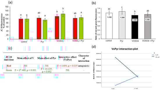 Effects of vanadium and/or pyruvate on MMP in CHO-K1 cells detected with the JC-10 staining method. The cells were incubated in DMEM/F12 medium without (control) or with 100 μM VOSO4 in the presence or absence of sodium pyruvate (Pyr) (4.5 mM) for 24 h. (a) Red and green JC-10 fluorescence emissions expressed in percentage, and (b) red/green fluorescence intensity ratio. Data represent the mean ± SD derived from 3 independent experiments each performed at least in triplicates. Means within the same color followed by a common letter are not significantly different. Data were analysed by one-way ANOVA followed by Tukey’s post hoc test; (c) Results of the two-way ANOVA analysis of red and green JC-10 fluorescence emissions after 24-h exposure to V (as VOSO4) and Pyr (pyruvate); NS: no significant effect; (d) interaction graph illustrating antagonistic interaction between V and Pyr for red JC-10 fluorescence emissions after 24-h incubation.