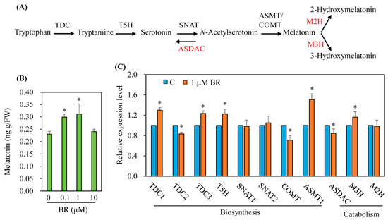 (A) Pathways of melatonin biosynthesis and catabolism. (B) Melatonin levels in rice seedlings treated with brassinosteroid in the absence of cadmium treatment. (C) Expression levels of transcripts encoding melatonin biosynthetic and catabolic genes. Seven-day-old rice seedlings were treated rhizosperically with various concentrations of epibrassinolide (BR) for quantification of melatonin or with 1 μM epibrassinolide (BR) for qRT-PCR for 24 h. The upper parts of leaves and stems were collected for HPLC quantification of melatonin and qRT-PCR analysis of various genes involved in melatonin synthesis and catabolism. The primer sequences were previously described [20]. C, water containing 0.1% ethanol. Asterisks (*) denote significant differences (p < 0.05; ANOVA, followed by Tukey’s HSD post hoc tests). C, water containing 0.1% ethanol; BR, epibrassinolide; TDC1, tryptophan decarboxylase 1 (AK069031); TDC2 (AK103253); TDC3 (Os08g0140500); T5H, tryptamine 5-hydroxylase (AK071599); SNAT1, serotonin N-acetyltransferase 1 (AK059369); SNAT2 (AK068156); COMT, caffeic acid O-methyltransferase (AK064768); ASMT1, N-acetylserotonin O-methyltransferase (AK072740); ASDAC, N-acetylserotonin deacetylase (AK072557); M3H, melatonin 3-hydroxylase (AK067086); M2H, melatonin 2-hydroxylase (AK119413); UBQ5, ubiquitin 5 (Os03g13170).