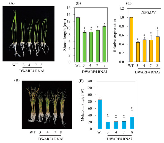 Generation of DWARF4-suppressed transgenic rice plants. (A) Phenotypes of 7-day-old wild-type (WT) and DWARF4 RNAi transgenic (T2) rice seedlings. (B) Shoot length measurement. (C) qRT-PCR analyses of WT and transgenic (T2) lines. (D) Phenotypes of 7-day-old rice seedling after cadmium treatment. (E) Melatonin levels of WT and transgenic lines. Seven-day-old rice seedlings were challenged with 0.5 mM cadmium for 3 days for quantification of melatonin. Asterisks (*) indicate significant differences from the wild type (p < 0.05), as determined by Tukey’s HSD post-hoc tests.