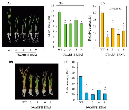 Generation of DWARF11-suppressed transgenic rice plants. (A) Phenotypes of 7-day-old wild-type (WT) and DWARF11 RNAi transgenic (T2) rice seedlings. (B) Shoot length measurement. (C) Results of qRT-PCR analyses of WT and transgenic (T2) lines. (D) Phenotypes of 7-day-old rice seedlings after cadmium treatment. (E) Melatonin levels of WT and transgenic lines. The 7-day-old rice seedlings were challenged with 0.5 mM cadmium for 3 days for quantification of melatonin. Asterisks (*) indicate significant differences from the wild type (p < 0.05), as determined by Tukey’s HSD post hoc tests.