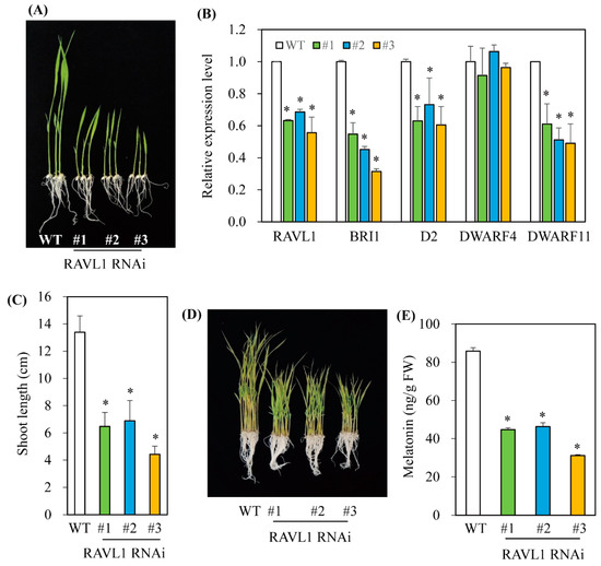 Generation of RAVL1-suppressed transgenic rice plants. (A) Phenotypes of 7-day-old wild-type (WT) and RAVL1 RNAi transgenic (T2) rice seedlings. (B) Shoot length measurement. (C) qRT-PCR analyses of WT and transgenic (T2) lines. (D) Phenotypes of 7-day-old rice seedling after cadmium treatment. (E) Melatonin levels of WT and transgenic lines. The 7-day-old rice seedlings were challenged with 0.5 mM cadmium for 3 days for quantification of melatonin. Asterisks (*) indicate significant differences from the wild type (p < 0.05) as determined by Tukey’s HSD post hoc tests. GenBank accession numbers are Os04g0581400 (RAVL1), AK101085 (BRI1), XP_015755947 (D2), AK106528 (DWARF11), AB206579 (DWARF4), and Os03g13170 (UBQ5).