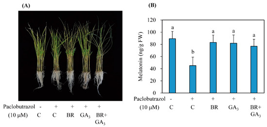 Restoration of melatonin synthesis by BR treatment under conditions of inhibition of GA biosynthesis. (A) Phenotypes of 7-day-old wild-type (WT) rice seedling treated with paclobutrazol together with either BR or GA3 alone or in combination for 24 h. The resulting rice seedlings were subjected to cadmium treatment (0.5 mM) for 3 days under conditions of continuous light for quantification of melatonin. (B) Melatonin quantification. The different letters denote significant differences (p < 0.05) as determined by Tukey’s HSD post hoc tests from the control (C). PB, paclobutrazol (10 μM); C, water containing 0.1% ethanol; BR, epibrassinolide (1 μM); GA3, gibberellic acid 3 (10 μM).