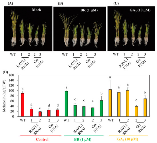 Effects of exogenous BR and GA in RAVL1 and Gα RNAi transgenic rice seedlings. (A–C) Phenotypes of 7-day-old rice seedlings after cadmium treatment in response to exogenous BR and GA3 treatments. (D) Melatonin levels of control-, BR-, and GA-treated rice seedlings. Seven-day-old wild-type (WT) and RNAi rice seedlings were challenged with either BR or GA for 24 h. The resulting rice seedlings were treated with 0.5 mM cadmium for 3 days under conditions of continuous light at 28 °C followed by HPLC quantification of melatonin. Different letters denote significant differences (p < 0.05), as determined by Tukey’s HSD post hoc tests. Mock, water containing 0.1% ethanol; BR, 1 μM epibrassinolide; GA3, 10 μM gibberellic acid 3.