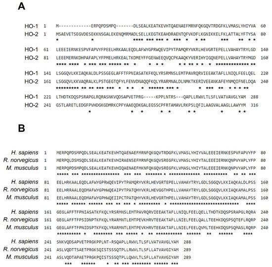 The amino acid alignment of HO. (A) Amino acid alignment of HO-1 and HO-2 in human. (B) The amino acid homology of HO-1 in humans, rat, and mice. Asterisks indicate common retention regions, meaning that the amino acids here are identical.