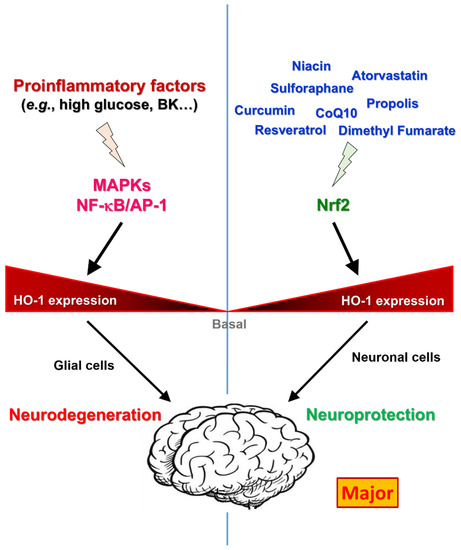 Since HO-1 induction plays a dual role in neuropathogenesis, the function of HO-1 in neuronal cells and in astrocytes, oligodendrocytes, and microglia needs to be considered at the stage of neurodegenerative disorders. Indeed, the role of HO-1 expression is highly complicated and not fully elucidated. However, whether HO-1 induction plays cytoprotective or cytotoxic effect in neuropathogenesis may be related to different signaling pathways [103]. That is to say, Nrf2-dependent activation of HO-1 exerts a cytoprotective effect, in which AP-1- or NF-κB-induced HO-1 activation seems to exert cytotoxic effects in the CNS.