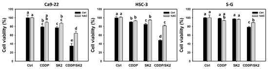 Cell viability for cisplatin (CDDP) and/or SK2. Following NAC preprocessing (10 mM for 1 h) or not, oral cancer (Ca9-22 and HSC-3) and normal oral (S-G) cells were processed with four treatments—control (0.1% DMSO), CDDP (10 μM), SK2 (10 μg/mL), and CDDP/SK2 (10 μM/10 μg/mL)—for 24 h and assessed by an MTS assay. For multi-comparisons, data without overlapping letters differ significantly (p < 0.05). The highest value is marked with a, and others are shown in descending order. The data are shown as means ± SD (n = 3). In the example of Ca9-22 cells, the cell viabilities between the control (black) and NAC (gray) for CDDP/SK2 (e vs. d), showing nonoverlapping characters, differed significantly. Similarly, the control (black) and CDDP/SK2 (black) (a vs. e) were significantly different. In contrast, the controls (black) for CDDP and SK2 (bc vs. c) did not differ significantly.