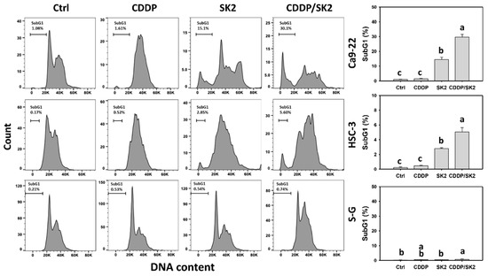 To assess the involvement of apoptosis in the antiproliferation of SK2, the subG1 status in cell cycle analysis was observed. The oral cell cycle patterns of four treatments—the control, cisplatin, SK2, and cisplatin/SK2—were demonstrated for oral cancer cells (Ca9-22 and HSC-3 cells) and normal cells (S-G) (Figure 2). A combined cisplatin/SK2 showed higher sub-G1 (%) than independent treatments (cisplatin or SK2) and control. Moreover, a combined cisplatin/SK2 increased more subG1 (%) in oral cancer cells than in normal cells (S-G), indicating that cisplatin/SK2 induces selectively subG1 accumulation in oral cancer cells indicating apoptosis.