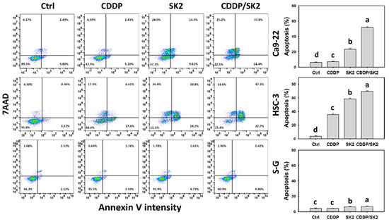 Annexin-V assessment for cisplatin (CDDP) and/or SK2. Oral cancer (Ca9-22 and HSC-3) and normal (S-G) cells were processed with four treatments—control (0.1% DMSO), CDDP (10 μM), SK2 (10 μg/mL), and CDDP/SK2 (10 μM/10 μg/mL)—for 24 h and assessed by an annexin-V assay. The annexin-V-positive (%) is defined as apoptosis (%). For multi-comparisons, data without overlapping characters differ significantly (p < 0.05). The highest value is marked with a, and others are shown in descending order. Data are shown as means ± SD (n = 3). In the example of Ca9-22 cells, the apoptosis (%) for control, CDDP, SK2, and CDDP/SK2 (d, c, b, a), showing nonoverlapping characters, differed significantly. For S-G cells, the controls and CDDP showing overlapping character “c” did not differ significantly.