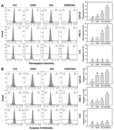 Apoptosis is triggered by the signaling of several caspases. The caspase assay was further applied to examine the apoptosis potential of subG1 accumulation in Figure 2 in terms of flow cytometry (pancaspase and Cas 3) and luminescence detection. A cisplatin/SK2 combined treatment displayed higher pancaspase (+) (%) in oral cancer cells (Ca9-22 and HSC-3) than the independent treatments (cisplatin or SK2) and control (Figure 4A). Moreover, a combined cisplatin/SK2 increased more pancaspase (+) (%) in oral cancer cells than in normal cells (S-G), indicating that cisplatin/SK2 induces selective pancaspase activation in oral cancer cells.