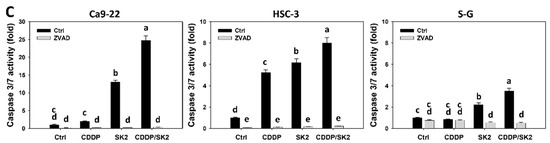 Similarly, luminescence detection of Cas 3/7 (Figure 4C) showed the same tendency as flow cytometry (Figure 4B). The Cas 3 induction of cisplatin/SK2 combined treatment was suppressed by ZVAD, suggesting that caspase signaling was triggered by apoptosis. Moreover, cisplatin/SK2 combined treatment induced more Cas 3/7 activity in oral cancer cells than in normal cells (S-G), suggesting that cisplatin/SK2 induces selective caspase activation in oral cancer cells (Figure 4C).