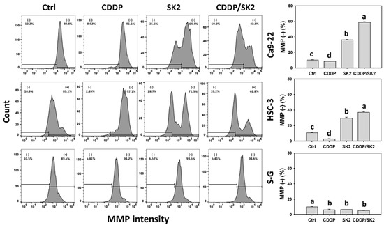MMP assays for cisplatin (CDDP) and/or SK2. Oral cancer (Ca9-22 and HSC-3) and normal (S-G) cells were treated in four ways—control (0.1% DMSO), CDDP (10 μM), SK2 (10 μg/mL), and CDDP/SK2 (10 μM/10 μg/mL)—for 24 h and assessed by an MMP assay; () is defined as low level of MMP. For multi-comparisons, data without overlapping characters differ significantly (p < 0.05). The highest value is marked with a, and others are shown in descending order. The data are shown as means ± SD (n = 3). In the example of Ca9-22 cells, the MMP () (%) for control, CDDP, SK2, and CDDP/SK2 (c, d, b, a), showing nonoverlapping characters, differed significantly.