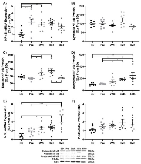 NF-κB signaling during the progression of T2DM. Mean ± SEM values of (A) NF-κB mRNA, (B) cytosolic NF-κB protein, (C) nuclear NF-κB protein, (D) acetylated Lys310 nuclear NF-κB protein, (E), IκBα mRNA, and (F) the ratio of phosphorylated to native IκBα protein in Sprague-Dawley (SD; n = 7), pre-diabetic UCD-T2DM (Pre; n = 9), 2-week diabetic UCD (2Wk; n = 9), 3-month diabetic UCD-T2DM (3Mo; n = 13), and 6-month diabetic UCD-T2DM (6Mo; n = 9) rats. * p < 0.05, ** p < 0.01, *** p < 0.001.