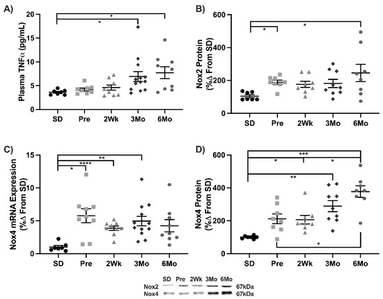 Several downstream targets responsible for heightened inflammation and oxidant production were measured to determine the increase in NF-κB activation altered gene expression. Plasma TNFα levels increased 112% in 3Mo and 134% in 6Mo animals compared to SD (Figure 2A). Nox2 protein increased 82% in Pre animals compared to SD and increased further by 134% in 6Mo animals (Figure 2B). Nox4 transcripts increased 4-fold in Pre, 2Wk, and 3Mo animals compared to SD (Figure 2C). Nox4 expression increased 2-, 3-, and 4-fold in 2Wk, 3Mo, and 6Mo old animals compared to SD, respectively. Nox4 expression was increased 77% and 83% in 6Mo animals compared to Pre and 2Wk, respectively (Figure 2D).