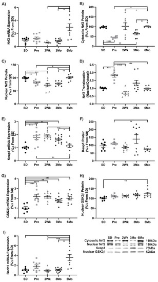 Nrf2 signaling during the progression of T2DM. Mean ± SEM values of (A) Nrf2 mRNA, (B) cytosolic Nrf2 protein, (C) nuclear Nrf2 protein, (D) Nrf2 translocation, (E) Keap1 mRNA, (F) Keap1 protein, (G) GSK3β mRNA, (H) nuclear GSK3β protein, and (I) Bach1 mRNA in Sprague-Dawley (SD; n = 7), pre-diabetic UCD-T2DM (Pre; n = 9), 2-week diabetic UCD (2Wk; n = 9), 3-month diabetic UCD-T2DM (3Mo; n = 13), and 6-month diabetic UCD-T2DM (6Mo; n = 9) rats. * p < 0.05, ** p < 0.01, *** p < 0.001, **** p < 0.0001.
