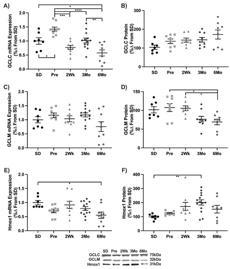 GCLC transcripts increased in Pre animals 42% compared to SD. GCLC transcripts decreased in 2Wk (−46%), 3Mo (−30), and 6Mo (−60%) animals compared to Pre. The 6Mo animals had the lowest number of transcripts with a 43% reduction compared to SD and 3Mo animals (Figure 4A). No changes were observed in GCLC protein (Figure 4B) or GCLM transcripts (Figure 4C). GCLM expression was decreased 35% in 6Mo animals compared to Pre and 2Wk animals (Figure 4D). Hmox1 transcripts decreased 45% in 6Mo animals compared to SD (Figure 4E). Hmox1 protein increased 67% in 3Mo (Figure 4F). These results suggest that reductions in Nrf2-related genes in concert with heightened NF-κB genes may make the heart more susceptible to oxidative damage.
