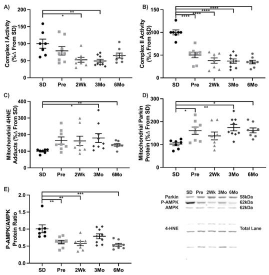 Mitochondrial function and damage were measured to determine if the mitochondrial dysfunction present in T2DM and other animals was observed in UCD-T2DM rats. Mitochondrial complex I activity decreased 47% in the 2Wk old ventricle compared to SD and remained suppressed in 3Mo animals by 51% (Figure 5A). Complex II was lowered in the Pre animals 50% compared to SD. Development of T2DM further decreased complex II activity in 2Wk old animals compared to SD at 62% and remained suppressed in 3Mo (−64%) and 6Mo (−67%) animals (Figure 5B). Mitochondrial HNE content was measured to determine the oxidative damage accrued in the mitochondria. HNE levels increased at 73% in 3Mo and remained elevated in 6Mo (+37%) old animals (Figure 5C). Mitochondrial parkin increased in the mitochondrial fraction 60% in the Pre animals compared to SD. This increase was sustained in the 3Mo (+74%) and 6Mo (+56%) animals (Figure 5D). The ratio of native and Phosphorylated AMPK (Thr172) demonstrated a reduction in Pre animals by 32%. These reductions were observed in 2Wk (−43%) and 6Mo (−47%) animals as well (Figure 5E). Collectively, these decreases in mitochondrial complex activity and increases in HNE and parkin suggest cardiac mitochondrial dysfunction in the UCD-T2DM rats consistent with T2DM pathogenesis.