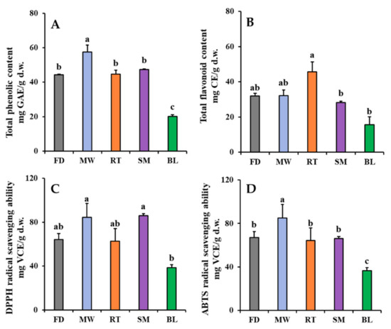 Changes in TPC (A), TFC (B), DPPH radical scavenging ability (C), and ABTS radical scavenging ability (D) of faba leaves after treatment by four domestic cooking methods (FD: freeze-dried (Control); MW: microwaving; RT: roasting; SM: steaming; BL: boiling). Values are averages with standard errors from triplicate experiments. Different letters on the graph bars indicate significant differences at p < 0.05 (Tukey’s HSD test).