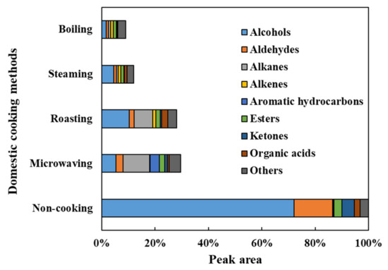 The VOCs in the faba leaves were analyzed by HS-SPME-GC/MS. Overall, 69 compounds were detected (Figure 4 and Table S2). The data are shown as the percentage for each volatile based on the total peak area of the uncooked faba leaves. These compounds were categorized into 9 groups: 26 alcohols, 11 aldehydes, 5 alkanes, 4 alkenes, 3 aromatic hydrocarbons, 6 esters, 6 ketones, 4 organic acids, and 4 other compounds (Figure 5, Table S2). The domestic cooking methods significantly reduced the total content of VOCs, by 29.52%, 28.11%, 11.88%, and 9.04%, after microwaving, roasting, steaming, and boiling, respectively (Figure 5). Similar results have also been reported by Selli et al. [19] who found that boiling and oven cooking significantly reduced the content of aroma compounds in two mushroom cultivars.