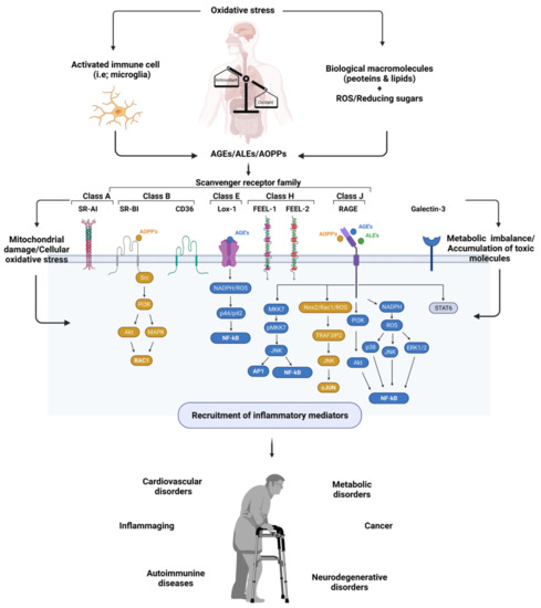 Exemplified figure for generation of inflammatory diseases with involvement of scavenger receptors and oxidative stress induced molecules, including AGEs, AOPPs, and ALEs; visualized using Biorender software [109].