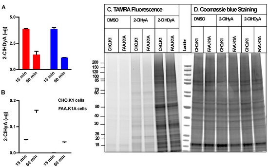 Confocal imaging of proteins modified by 2-ClHDyA and 2-ClHyA in CHO.K1 (A) and FAA.K1A (B) cells. CHO.K1 and FAA.K1A treated with 2-ClHDyA and 2-ClHyA as described in Figure 1 were subjected to confocal microscopy as described in Section 2. TAMRA in red indicates localization of proteins modified by 2-ClHDyA and 2-ClHyA and blue is DAPI nucleus staining; (C) Total corrected cell fluorescence was measured using ImageJ from CHO.K1 and FAA.K1A cells treated with DMSO, 10 µM 2-ClHDyA or 10 µM ClHyA following 1 h incubation. Mean + SEM **** p < 0.0001 and not significance (ns) for comparison within 2-ClHDyA and 2-ClHyA treatment between CHO.K1 and FAA.K1A cells, respectively.