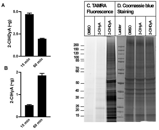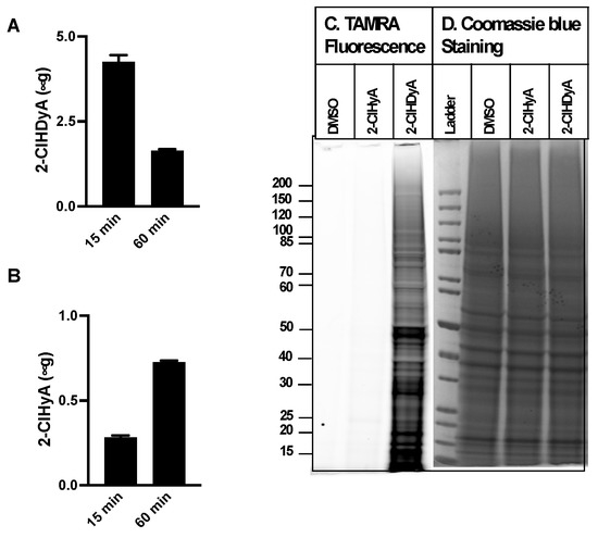 CHO.K1, FAA.K1A, EA.hy926, and HLMVEC cells were grown to confluence in 6-well plates. Cells were treated with either DMSO, 10 µM 2-ClHyA or 10 µM 2-ClHDyA for 1 h at 37 °C. After 1 h, cells were lysed with RIPA lysis buffer with 1XcOmplete mini EDTA-free protease inhibitor cocktail and 400 µM phenylmethylsulfonyl fluoride (PMSF) protease inhibitor. Cells were lysed and DNA sheared by passing through a 26G needle four–five times. Insoluble material in the lysates was removed by centrifuging at 14,000× g for 20 min at 4 °C. Protein concentration was determined using the BCA assay (Pierce cat. 23225, Thermo Fisher Scientific, Waltham, MA, USA). Protein lysates (100 µg) were conjugated to carboxytetramethylrhodamine (TAMRA)-azide as previously described using the Click-It daction buffer kit (Thermo Fisher Scientific, cat.10269, Waltham, MA, USA), following the manufacturer’s protocols [25]. Proteins were precipitated in methanol-chloroform. NuPAGE LDS Sample buffer (2X) (Invitrogen, cat. NP0007, Waltham, MA, USA) was added to the dry pellet at a concentration of 1–2 mg/mL. Samples were heated at 70 °C for 10 min and then cooled and centrifuged at 15,000× g for 5 min. Proteins were then resolved on 4–12% Bis-Tris gels by electrophoresis with MOPS running buffer. Modified proteins were subsequently visualized at 532/580 nm (excitation/emission) using a Typhoon imager. After visualization, the gel was stained with Coomassie blue for total protein using the SimplyBlue SafeStain (Invitrogen, Waltham, MA, USA).