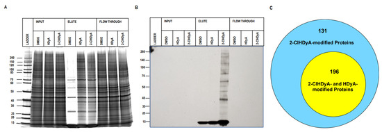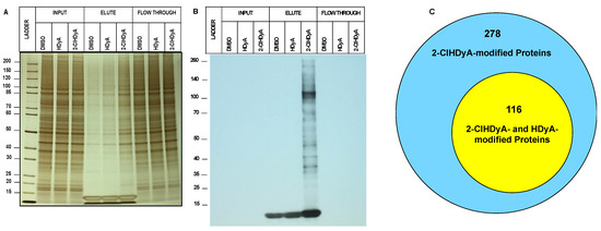 2-ClHDyA modified EA.hy926 cell proteins. Silver-stained gel (A) and Western blot (B) probed with streptavidin HRP of the samples from A were prepared as described in Section 2. Protein loads showing total proteins from lysates from each indicated condition (DMSO vehicle, HDyA (non-chlorinated aldehyde control) and 2-ClHDyA) input onto beads, elute from beads, and supernatant (Flow Through); (C) Venn diagram of number of 2-ClHDyA- and HDyA-modified proteins in EA.hy926 cells.