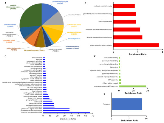 Bioinformatic characterization of EA.hy926 proteins modified by 2-ClHDyA. (A) Distribution of 2-ClHDyA-modified proteins by protein class analyzed using Panther; (B–E) Over representation analysis using the Web-based Gene Set Analysis Toolkit (WebGestalt). Enriched categories in Gene ontology (GO) Biological function (B); Cellular component (C); Molecular function (D); and KEGG Pathway using Bonferroni p < 0.05 for computing FDR (p < 0.05) (E).