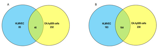 Shared and unique proteins in EA.hy926 cells and HLMVECs modified by 2-ClHDyA. (A) Venn diagram of number of proteins specifically modified by 2-ClHDyA in EA.hy926 cells and HLMVECs; (B) Venn diagram of number of proteins modified by 2-ClHDyA including those modified by HDyA in EA.hy926 cells and HLMVECs.