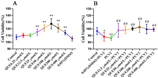 The viability of 3D4/2 cells (%, n = 6). (A) Control group; QUE6.25 μmol/L: 6.25 μmol/L QUE; QUE12.5 μmol/L: 12.5 μmol/L QUE; QUE25 μmol/L: 25 μmol/L QUE; QUE50 μmol/L: 50 μmol/L QUE; QUE100 μmol/L: 100 μmol/L QUE; QUE200 μmol/L: 200 μmol/L QUE; QUE400 μmol/L: 400 μmol/L QUE; 0.05% DMSO: culture medium containing 0.05% DMSO. ** p < 0.01. (B) Control: control group; 0.05% DMSO + PCV2: PCV2 + 0.05% DMSO; PCV2: PCV2-infected group; QUE12.5 μmol/L: PCV2 + 12.5 μmol/L QUE; QUE25 μmol/L: PCV2 + 25 μmol/L QUE; QUE50 μmol/L: PCV2 + 50 μmol/L QUE; QUE100 μmol/L: PCV2 + 100 μmol/L QUE; QUE200 μmol/L: PCV2 + 200 μmol/L QUE; QUE400 μmol/L: PCV2 + 400 μmol/L QUE. * p < 0.05, ** p < 0.01 and ## p < 0.01.