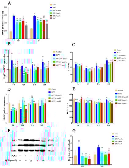 Effect of QUE on ROS levels and its regulation of histone acetylation modification in PCV2-infected 3D4/2 cells in vitro. (A) The production level of ROS. (B,C) The mRNA expression level and enzyme activity of HAT. (D,E) The mRNA expression level and enzyme activity of HDAC. (F,G) The expression levels of histones AcH3 and AcH4. Control: control group; PCV2: PCV2-infected group; QUE100 μmol/L: PCV2 + 100 μmol/L QUE; QUE50 μmol/L: PCV2 + 50 μmol/L QUE; QUE25 μmol/L: PCV2 + 25 μmol/L QUE; NAC: 1 mM NAC + PCV2. * p < 0.05, ** p < 0.01, # p < 0.05 and ## p < 0.01.