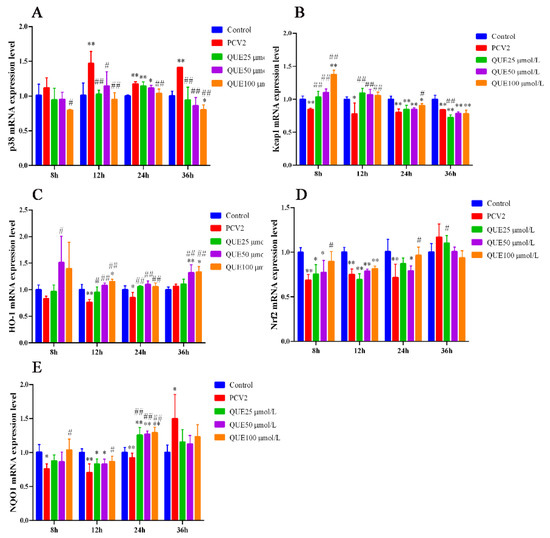 Effect of QUE on p38, Keap1, HO-1, Nrf2 and NQO-1 mRNA expression of genes in PCV2-infected 3D4/2 cells. (A–E) The mRNA expression levels of p38, Keap1, HO-1, Nrf2 and NQO1. Control: control group; PCV2: PCV2-infected group; QUE100 μmol/L: PCV2 + 100 μmol/L QUE; QUE50 μmol/L: PCV2 + 50 μmol/L QUE; QUE25 μmol/L: PCV2 + 25 μmol/L QUE. * p < 0.05, ** p < 0.01, # p < 0.05 and ## p < 0.01.