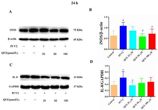 Effects of QUE on iNOS and IL-8 protein expression in PCV2-infected 3D4/2 cells. (A–D) The protein expression levels of iNOS and IL-8. Control: control group; PCV2: PCV2-infected group; QUE100 μmol/L: PCV2 + 100 μmol/L QUE; QUE50 μmol/L: PCV2 + 50 μmol/L QUE; QUE25 μmol/L: PCV2 + 25 μmol/L QUE. * p < 0.05 and # p < 0.05.