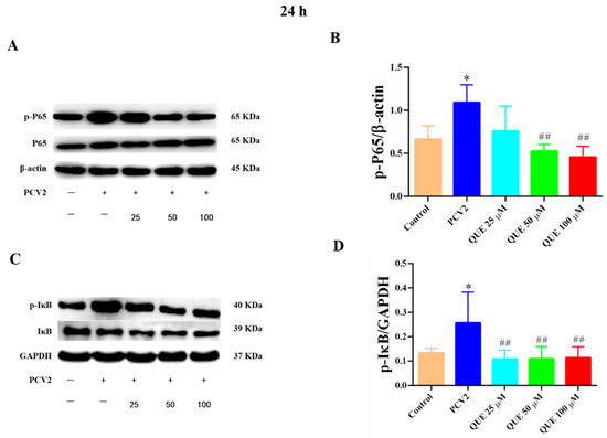 As shown in Figure 7, compared with the control group, PCV2 infection of 3D4/2 cells at 24 h significantly increased the levels of total p65 protein phosphorylation and IκB protein phosphorylation (p < 0.05). Compared with the PCV2-infected group, QUE treatment from 50 to 100 μmol/L at 24 h was able to downregulate the protein expression level of p-p65 in PCV2-infected 3D4/2 cells, and QUE treatment from 25 to 100 μmol/L extremely downregulated the protein phosphorylation levels of IκB (p < 0.01). These results indicate that PCV2-infected 3D4/2 cells could upregulate the expression levels of total cellular protein p65 and IκBα phosphorylation, while the phosphorylation of p65 and nucleation were inhibited post-QUE treatment.