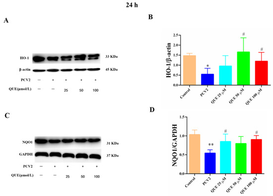 As shown in Figure 8, compared with the control group, the protein expression levels of HO-1 and NQO1 were significantly attenuated in PCV2-infected 3D4/2 cells (p < 0.05 or p < 0.01). Compared with the PCV2-infected group, QUE treatment at 50 or 100 μmol/L could significantly inhibit the reduction of HO-1 protein expression in PCV2-induced 3D4/2 cells, and QUE at 25 or 100 μmol/L could significantly inhibit the protein expression levels of NQO1 in PCV2-infected cells post-treatment at 24 h (p < 0.05).