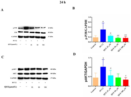 Effects of QUE on P38 and pAKT protein expression in PCV2-infected 3D4/2 cells. (A–D) The protein expression levels of p-P38 and pAKT. Control: control group; PCV2: PCV2-infected group; QUE100 μmol/L: PCV2 + 100 μmol/L QUE; QUE50 μmol/L: PCV2 + 50 μmol/L QUE; QUE25 μmol/L: PCV2 + 25 μmol/L QUE. * p < 0.05, # p < 0.05 and ## p < 0.01.