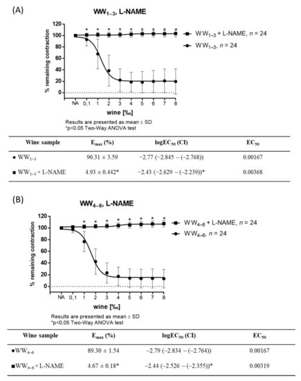 WW-induced relaxation in NA-precontracted (10−7 mM) aortic rings with or without 300 mmol/L L-NAME in WW1–3 (A); WW4–6 (B); WW7–9 (C) and WW10–12 (D) groups (n = 8 per wine sample (24 per group)) and between groups (E). Tables below graphs presents maximum vasodilation (Emax) values as mean ± values, and the 50% effective concentration (EC50) was calculated using nonlinear regression analysis. EC50 values are a log of dilution giving 50% of relaxation relative to the sample’s own maximal relaxation (1‰ = 0.001; log 0.001 = −3 and 2‰ = 0.002; log 0.002 = −2.70), with the 95% confidence interval (CI) in parentheses. Results are shown as mean ± SD; * p < 0.05.