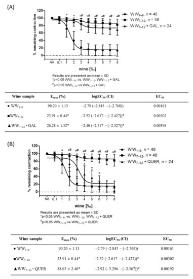 All results are expressed as an arithmetic mean ± standard deviation (SD). p < 0.05 was considered statistically significant. White wine-induced relaxation (WWIR) is expressed as a percentage of the maximum contraction. The aortic rings’ responses to white wine samples were analyzed by Two-way ANOVA with a post hoc Bonferoni test, otherwise ordinary One-way ANOVA test or Kruskal-Wallis test, followed by the Holm-Sidak post hoc test, respectively. SigmaPlot v.12 (Systat Software, Inc., Chicago, IL, USA) and GraphPadPrism, Version 5.00 for Windows, GrafPad Software (San Diego, CA, USA) were used for statistical analysis.