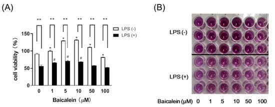 According to our results, baicalein increased the viability of the macrophages alone and demonstrated effects against LPS at concentrations ranging from 1–10 µM (Figure 2).