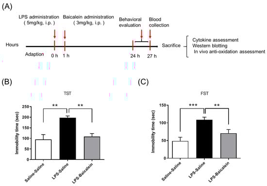 Study design and therapeutic effects of baicalein in mitigating LPS-induced depression-like behaviors. The time schedule of the study design (A). The control group was administrated with normal saline twice (at 0 h and 1 h). The LPS-treated group was administrated with saline instead of baicalein at 1 h. LPS-induced depression-like behavior was evaluated using the tail suspension test (B) and forced swimming test (C). Both tests show that immobility duration increased after administration of LPS (5 mg/kg i.p.). Treatment with baicalein (3 mg/kg i.p.) 1 h after LPS administration markedly reduced the immobility duration and improved depression-like behaviors. Data are presented as means ± SEM. (n = 6) ** p < 0.01, *** p < 0.001.