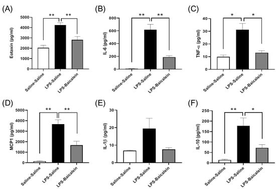 The concentrations of circulating cytokines, except those of IL-1β, increased significantly after the systemic challenge with LPS. The levels of IL-6, IL-10, eotaxin, monocyte chemoattractant protein-1 (MCP-1), and TNF-α were significantly downregulated in mice treated with both LPS and baicalein. The results showed that baicalein effectively moderated the peripheral immune response and inhibited inflammation (Figure 4).