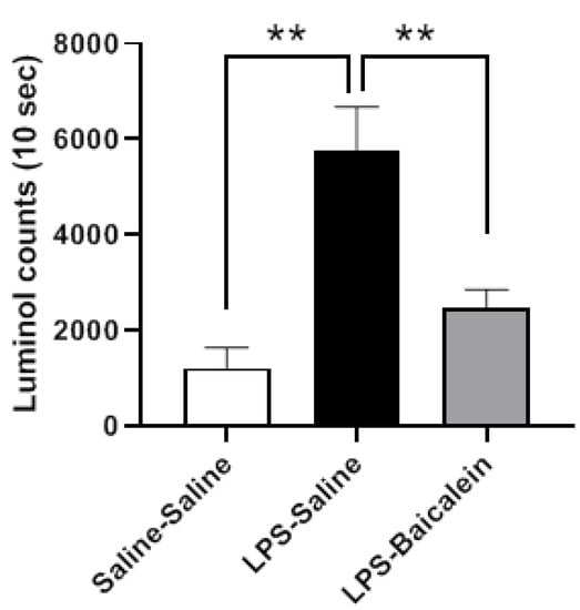 Compared with the control group, the plasma of LPS-treated mice exhibited reduced scavenging activity for H2O2, which was restored after baicalein administration. Baicalein clearly demonstrated beneficial effects against LPS-induced oxidative stress under in vivo conditions (Figure 5).