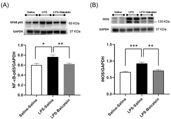 To evaluate inflammation in the hippocampus, NF-κB-p65 and iNOS protein levels were measured via western blotting. As iNOS is the downstream target of NF-κB-p65 during the induction of the inflammatory response, both NF-κB-p65 and iNOS levels increased significantly in LPS-treated mice, but decreased significantly in the LPS-baicalein-treated mice (Figure 6); hence, baicalein was shown to reduce neuroinflammation.